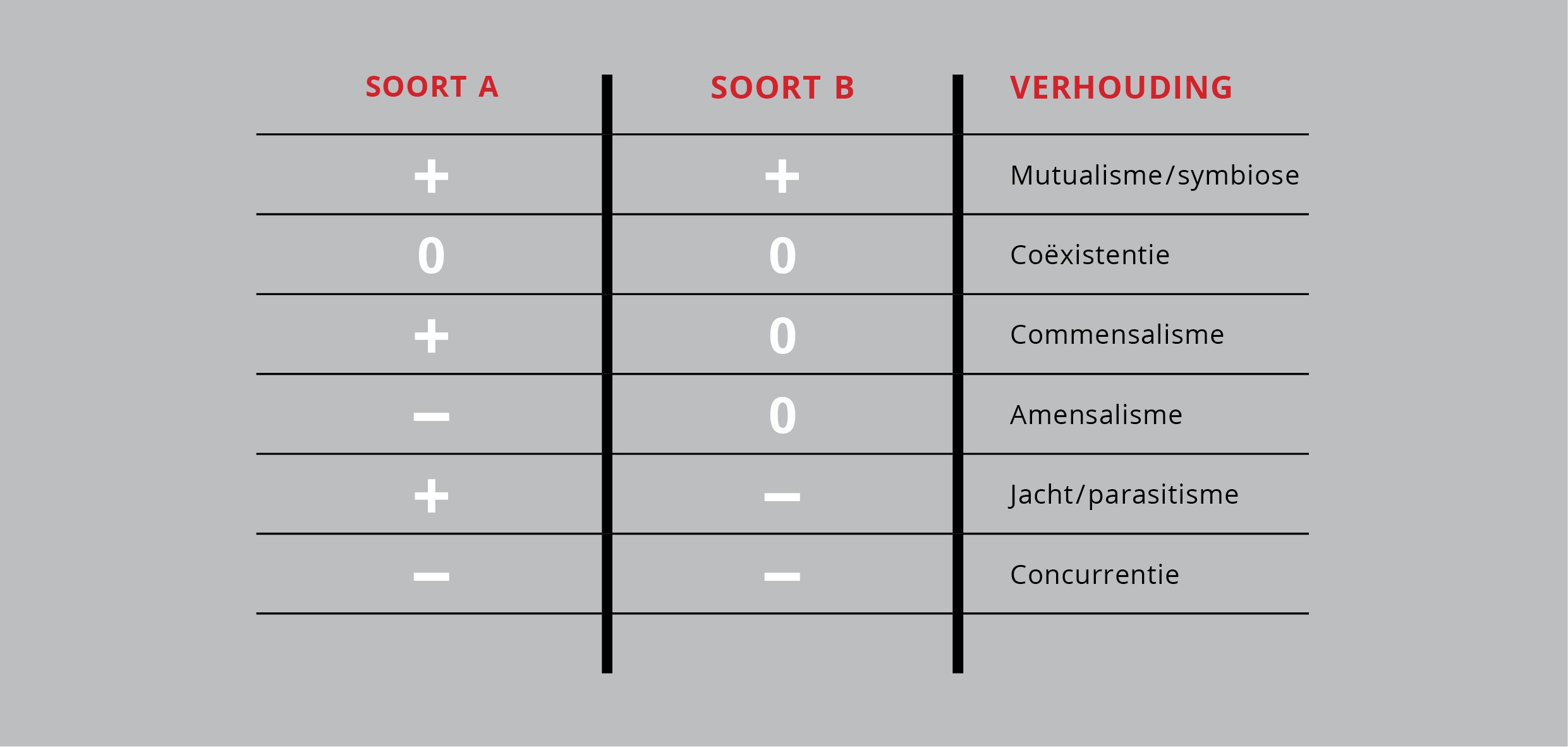 De wederzijdse steun met een + voor A én B noemen we dan mutualisme, en symbiose als de twee niet zonder elkaar kunnen. In neutrale verhoudingen 0/0 heet het co-existentie. Dat is het geval bij de boomsoort in het tropisch regenwoud die boombewonende mieren overdag als hun jachtterrein gebruiken om insecten te vangen, terwijl ’s nachts de nachtdieren de boom gebruiken totdat de zon opkomt.