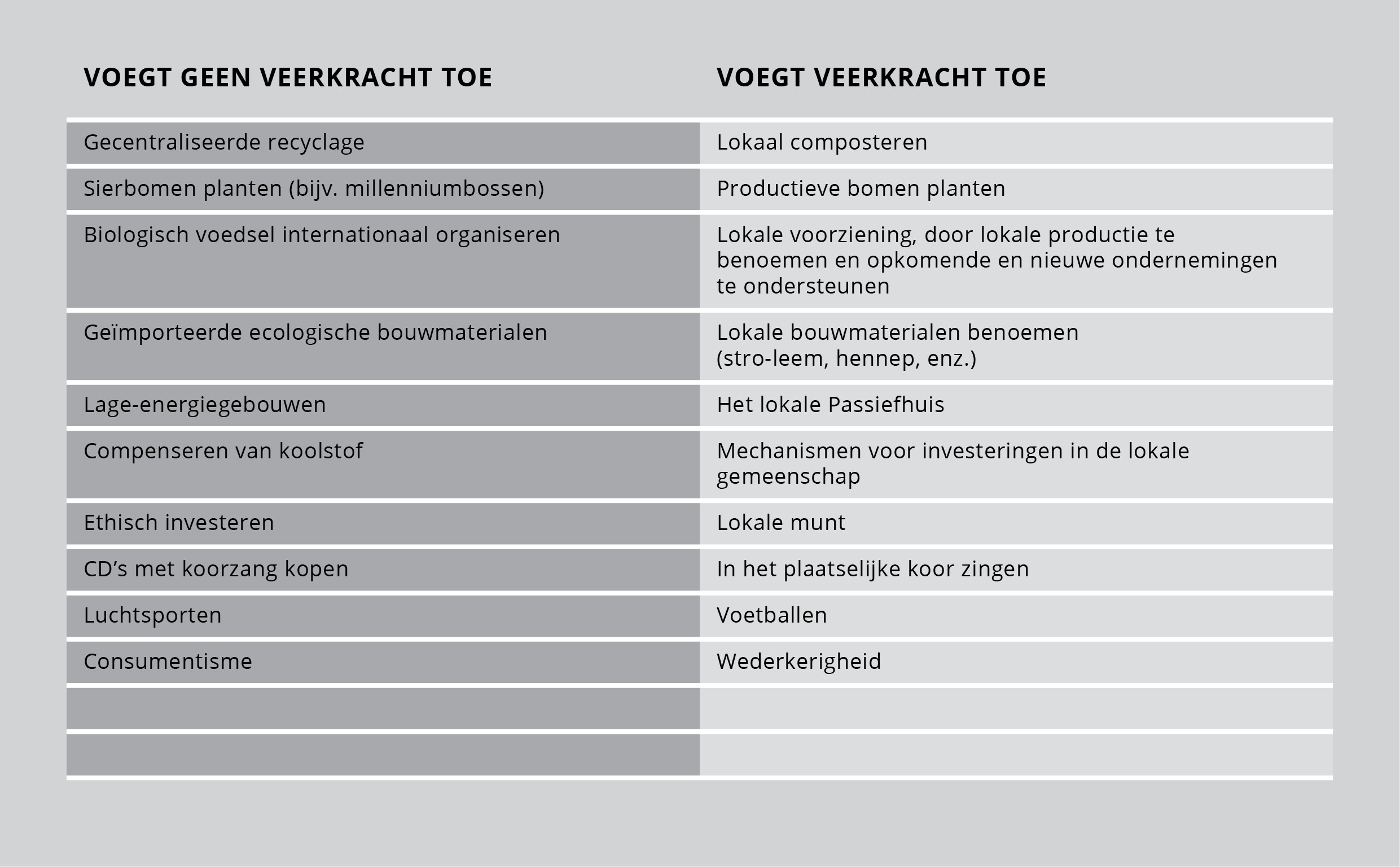 Het gaat dan in de eerste plaats om het opnieuw opbouwen van lokale landbouw en voedselproductie, om de decentralisering van de energieproductie, om het hèrdenken van de gezondheidszorg, om de herontdekking van lokale bouwmaterialen in de context van nulenergiebouw, om het opnieuw bekijken hoe we met afval omgaan; allemaal initiatieven die veerkracht creëren en die de mogelijkheid in zich dragen van een buitengewone renaissance – economisch, cultureel en spiritueel.