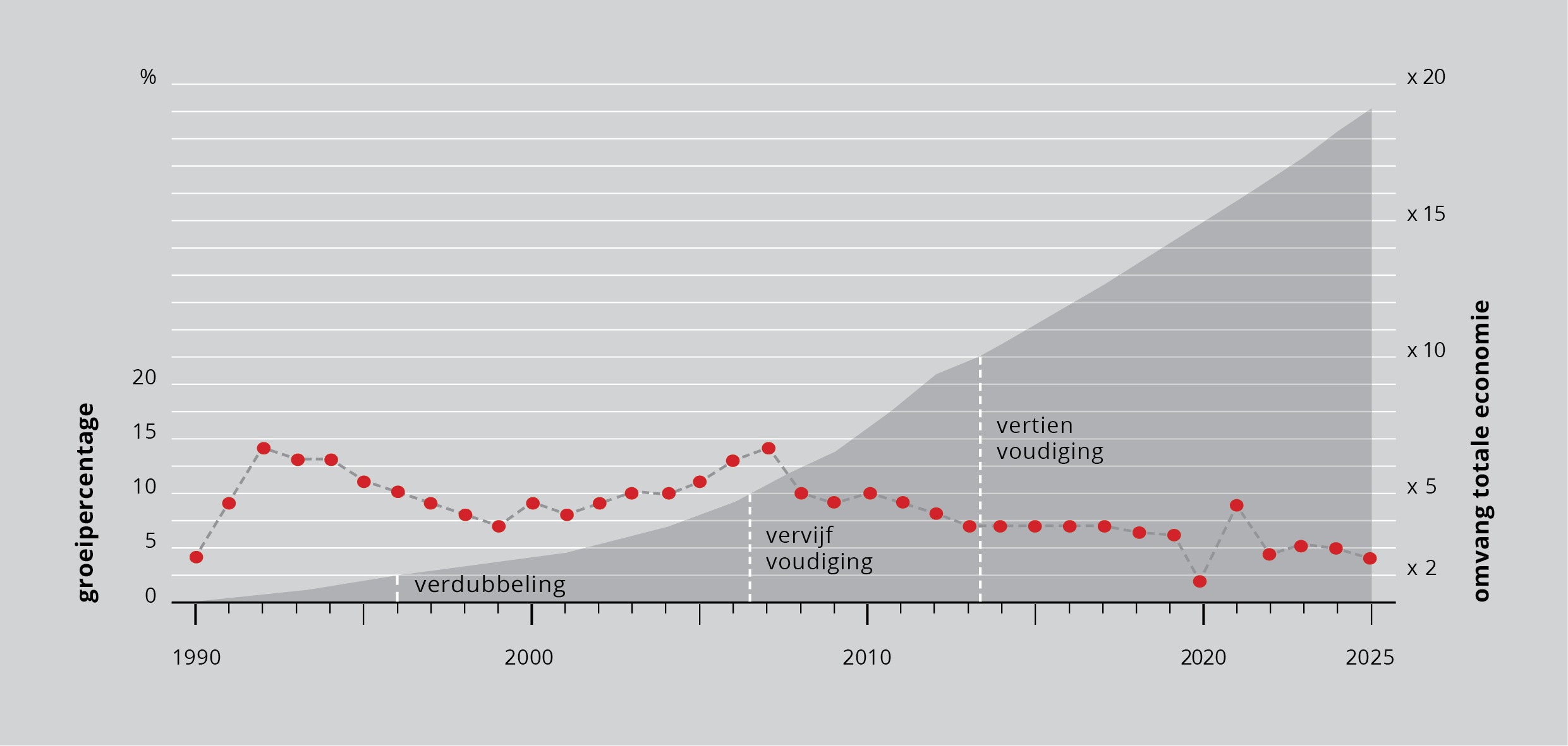 Vanaf 1990 begon de economie van China explosief te groeien. De op hele procenten afgeronde groeicijfers staan in figuur 2 als vette punten in een lijn. De omvang van de economie is donkergrijs. We zien dat het vanaf 1990 zeven jaar duurt voordat de economie verdubbeld is. De volgende verdubbeling duurt ook (bijna) zeven jaar. De economie is in 2005 dus ruim vier keer zo groot als in 1990. Al in 2011 is de volgende verdubbeling een feit. De economie is nu acht keer zo groot als in 1990. En in 2014 is hij tien keer zo groot als in 1990.